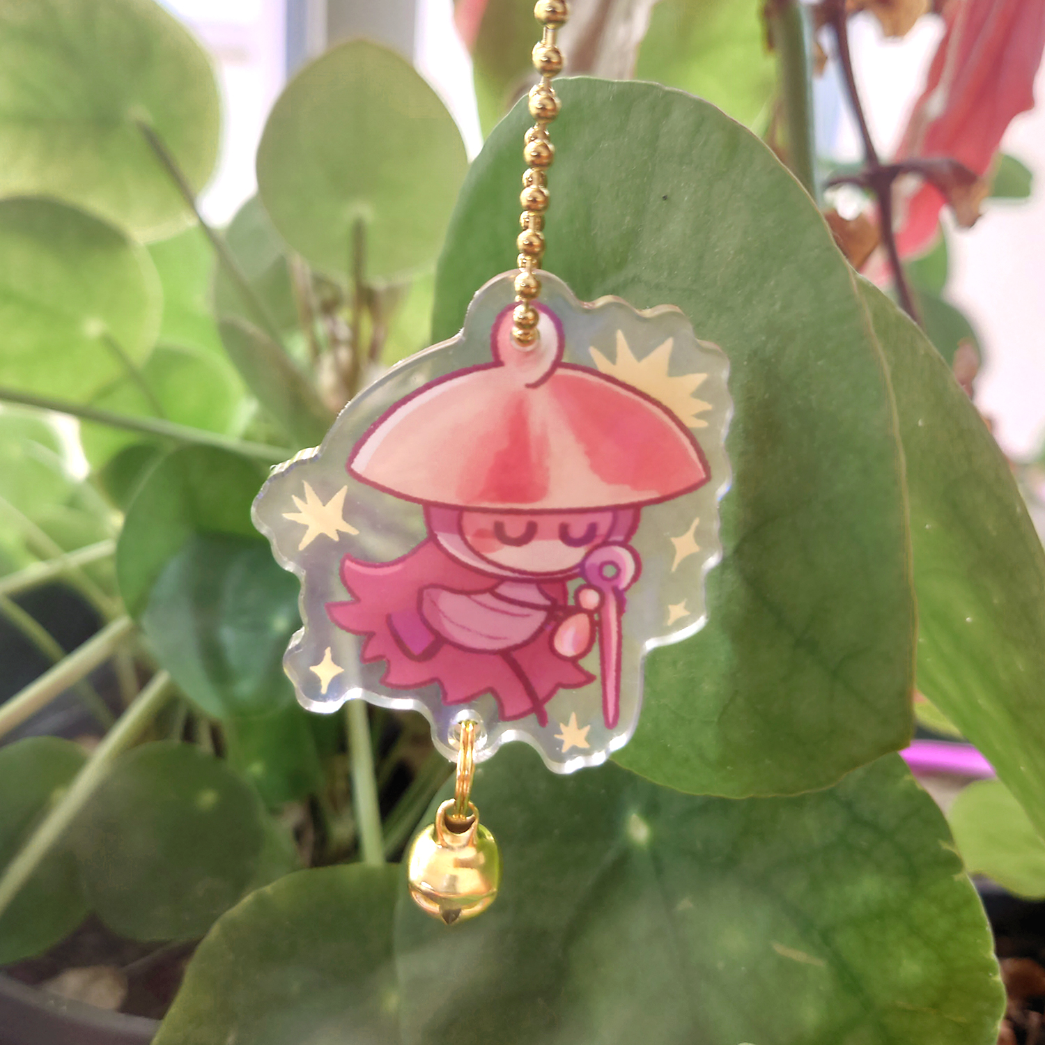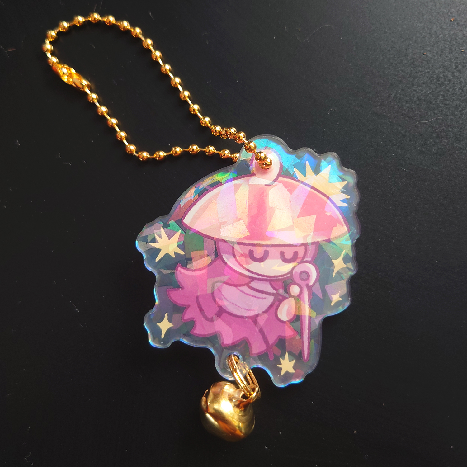 Porte clé en plastique acrylique imprimé recto/verso avec un filtre pailleté des deux côtés + 1 clochette suspendue